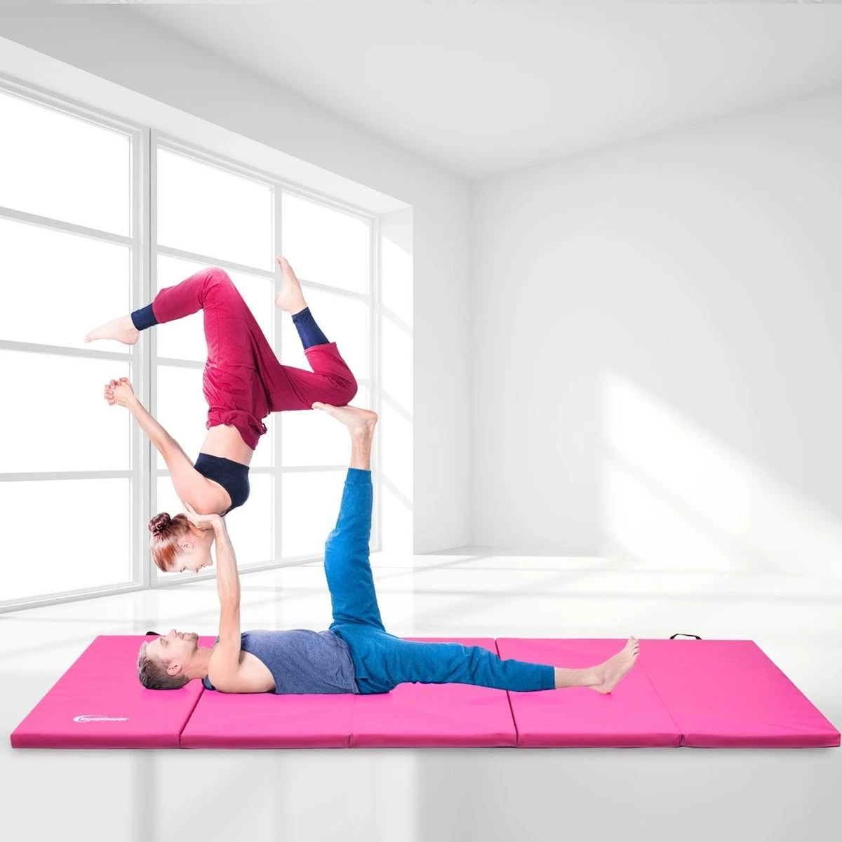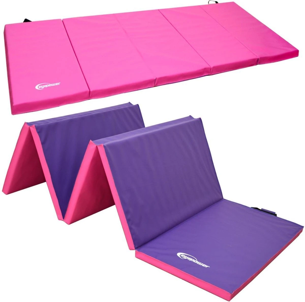 Dankzij de draaggreep wordt de klapmat onderweg een tas. De klittenbandsluiting op het handvat zorgt ervoor dat de oefenmat staat.