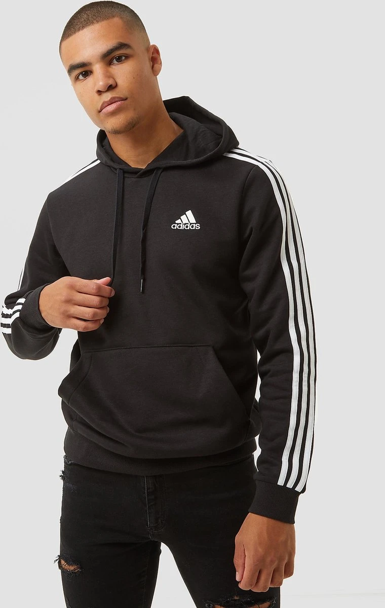 Houd jezelf warm tussen de trainingen door met deze zwarte adidas Essentials 3-Stripes fleece trui voor heren. Deze herentrui is gemaakt van een combinatie van katoen en fleece waardoor je extra warm blijft. De capuchon met trekkoord beschermt je tegen gure wind, terwijl je je handen warm houdt in het buidelzakje aan de voorkant. Op momenten waarop je iets minder warmte nodig hebt stroop je de mouwen makkelijk op dankzij de geribde manchetten. De iconische adidas-strepen over de schouders en mouwen en het logo op de voorkant geven de hoodie een sportieve look.