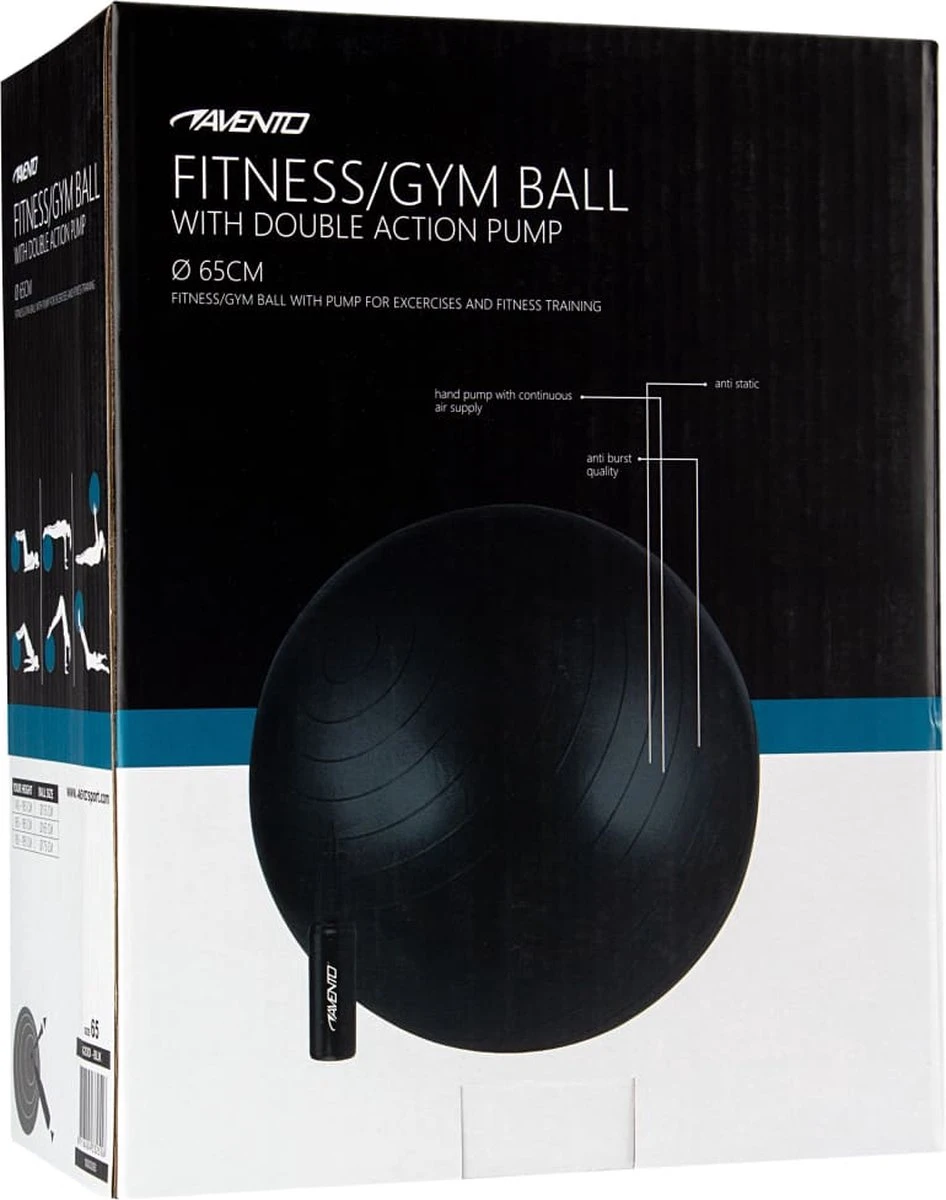 Deze Avento gymnastiekbal met een doorsnee van 65 cm is ideaal voor sit-ups, rugoefeningen en een algemene fitnesstraining. Maar de Swiss ball wordt ook gebruikt om de stabiliteit van de romp te vergroten en om verschillende aerobics- en fysiotherapie oefeningen uit te voeren. Daarnaast wordt de gymnastiek bal in toenemende mate gebruikt als vervanger van een (bureau)stoel waardoor een betere zithouding wordt aangenomen en diverse spieren ongemerkt worden versterkt. Geschikt voor een gebruiker met een lichaamslengte van ca. 165 tot 185 cm en een lichaamsgewicht tot 100 kg. De yogabal is gemaakt van anti-burst kwaliteit zodat deze niet plotseling explodeert wanneer deze overbelast wordt of in aanraking komt met scherpe voorwerpen. De fitnessbal heeft een diameter van 65 cm en is huidvriendelijk en anti-statisch waardoor stof niet wordt aangetrokken. Dit product wordt geleverd met de speciale Avento double-action handpomp voor het eenvoudig oppompen van deze gymbal.