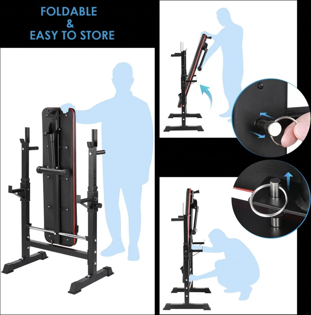 Bovendien bevat de set een verstelbare halterstang standaard. De standaards zijn gemaakt van dik plaatstaal, waardoor ze veilig en stabiel zijn. Je kunt de standaard eenvoudig aanpassen aan jouw lengte en trainingsbehoeften.