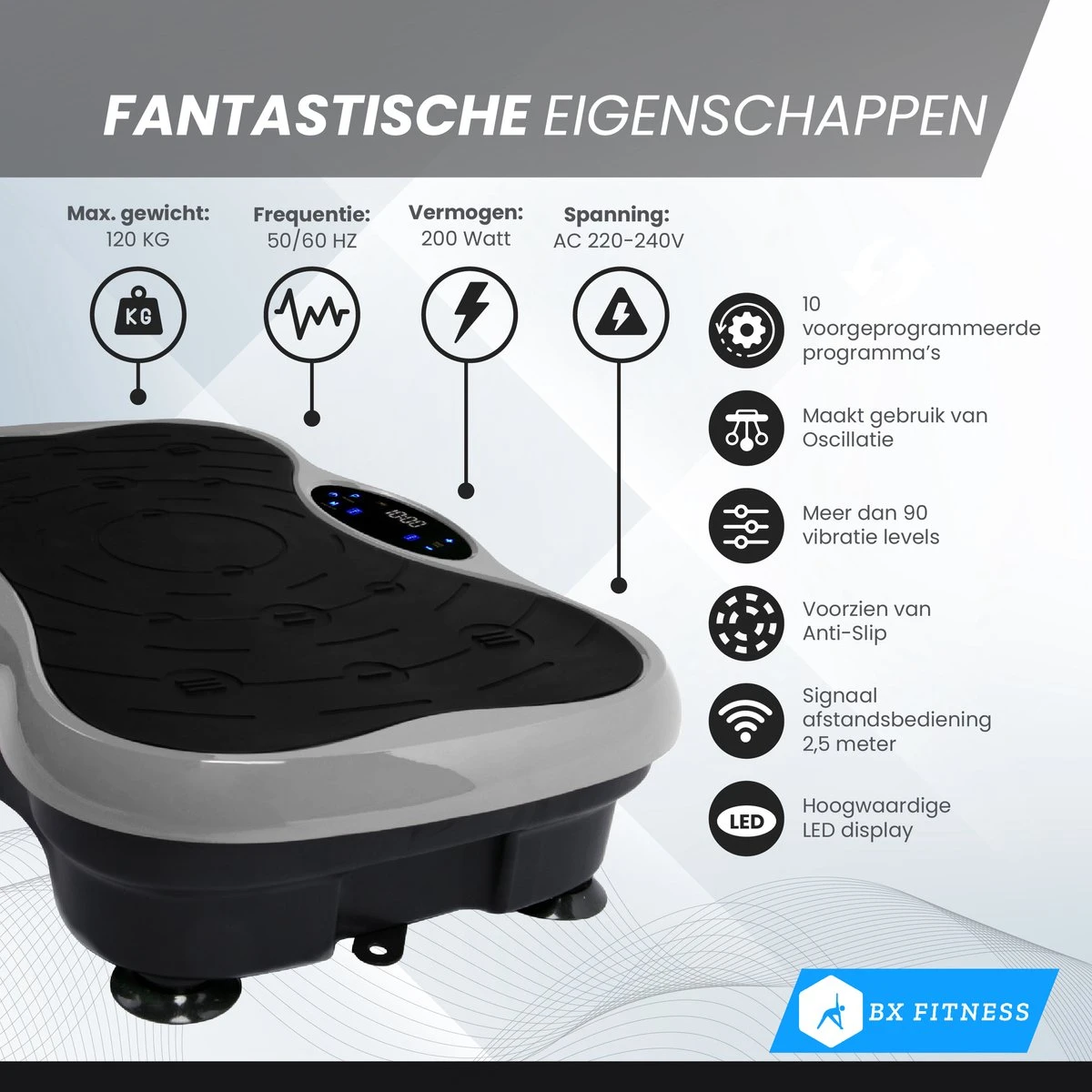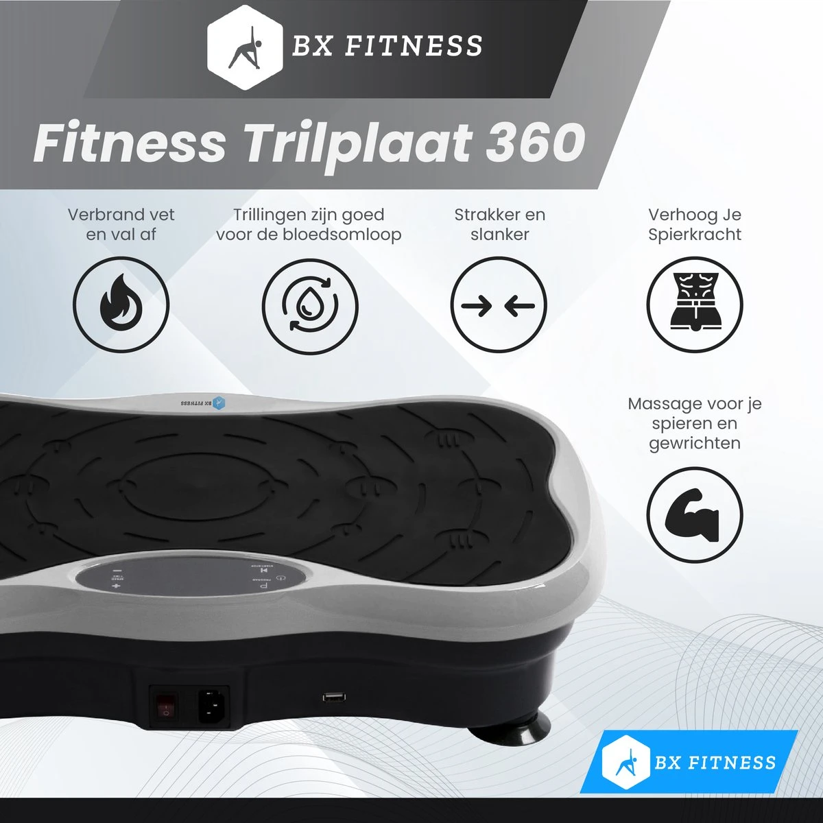Combineer eenvoudig je cardio, – en krachttrainingen met de Trilplaat 360 van BX Fitness®. De powerplate is perfect voor het verbranden van calorieën en vet, geeft de spieren een boost en verbetert de bloedsomloop. Door de combinatie van trillingen en oscillatie wordt je lichaam getraind als nooit tevoren.