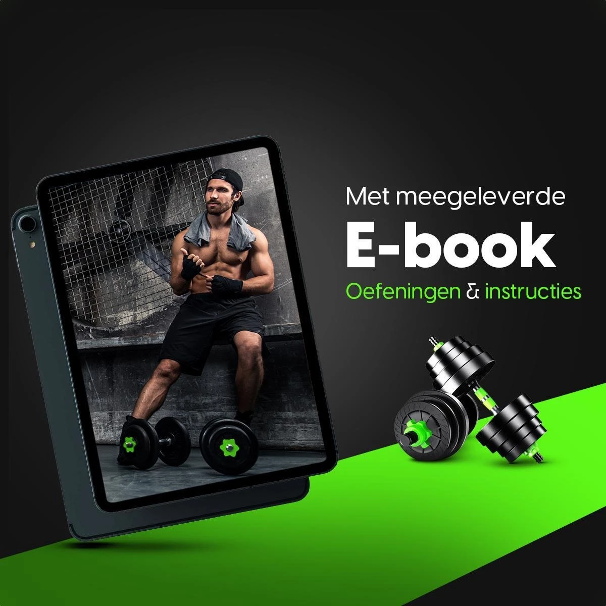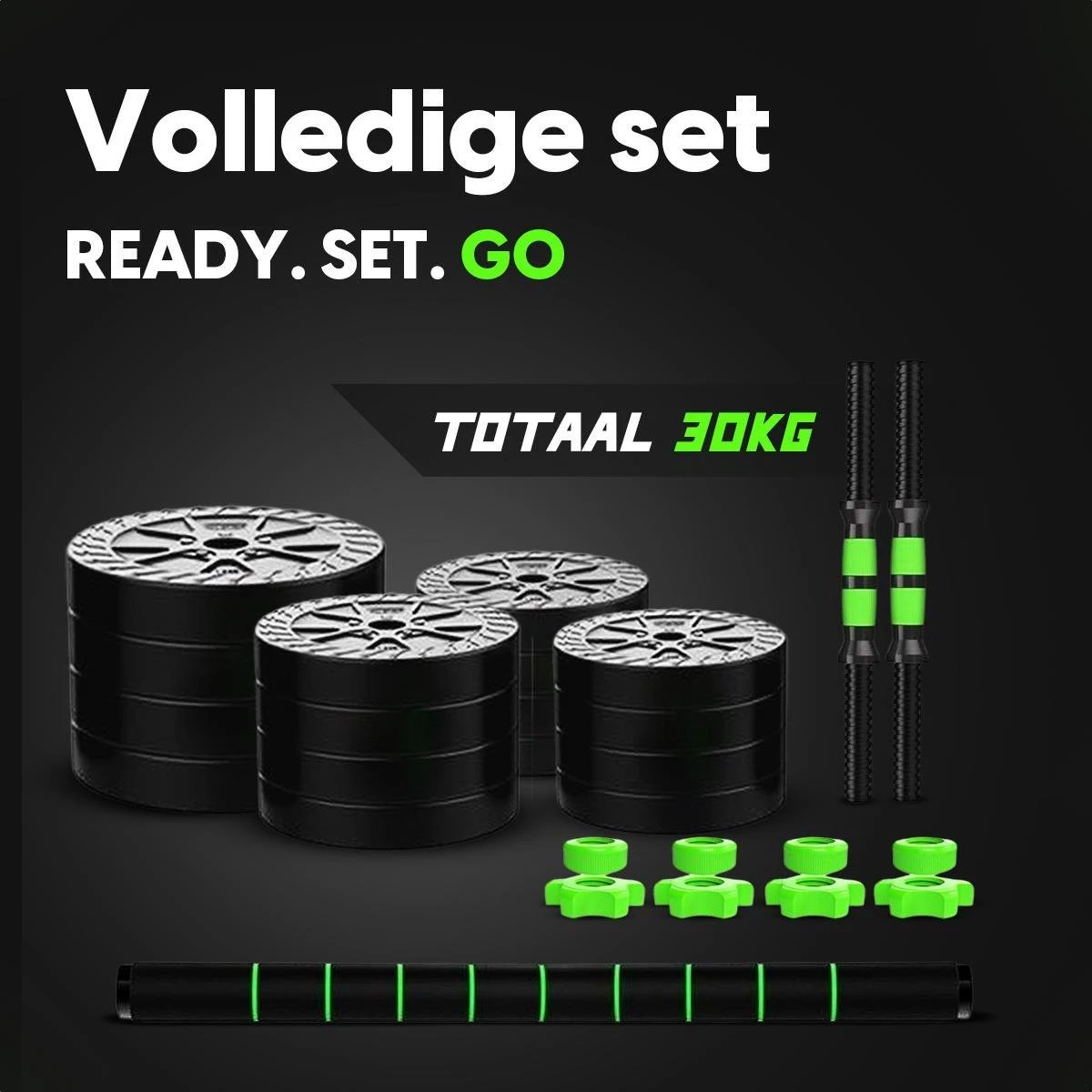 Jouw set wordt geleverd met 2 halters en een extra lang tussenstuk waarmee je jouw dumbells tot fitness stang kunt transformeren. Met meerdere schijven kies jij jouw ideale gewicht en geniet je van een efficiënte thuistraining.