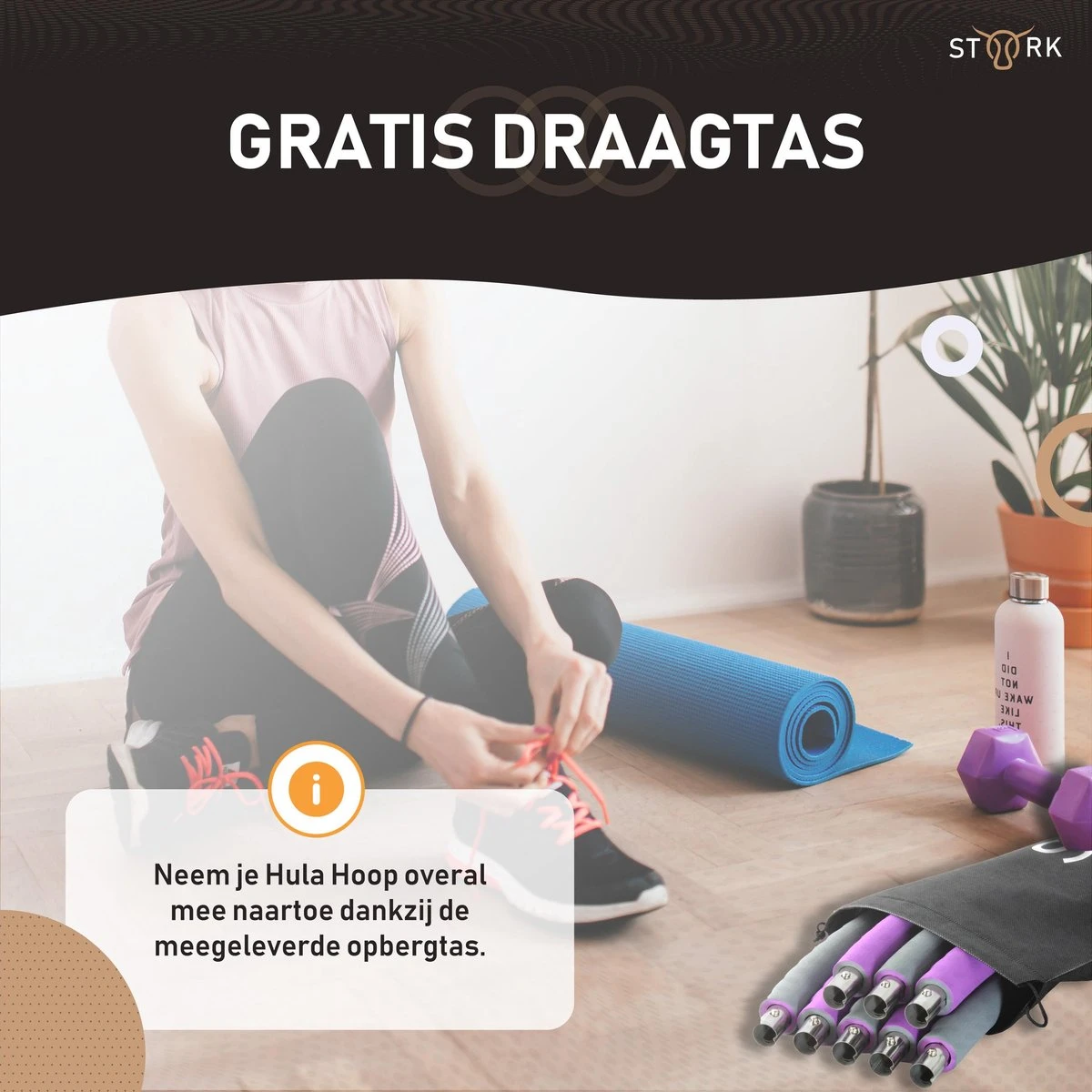 Onze STRK hoelahoep bestaat uit 8 afneembare secties die eenvoudig in en uit elkaar te halen zijn. Met de bijgeleverde draagtas kun je de hoelahoep eenvoudig opbergen en makkelijk meenemen. Train overal waar je maar wilt.