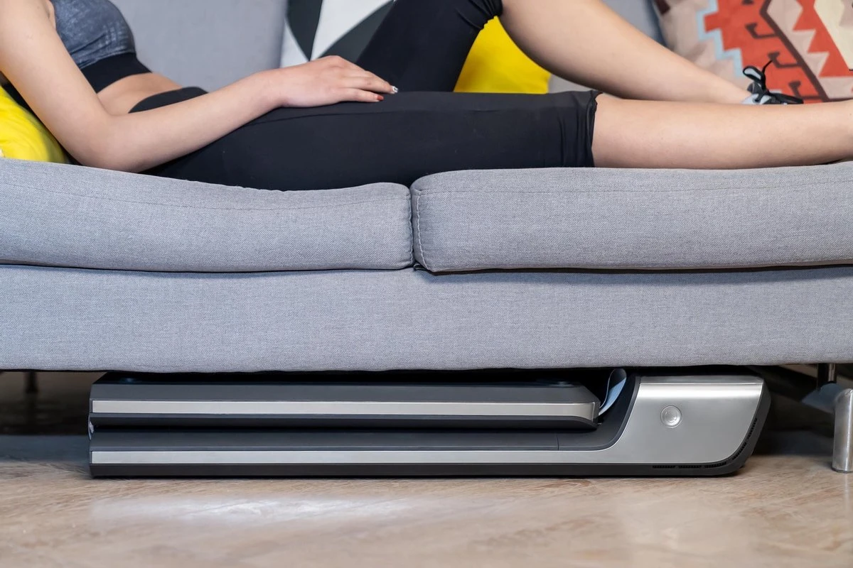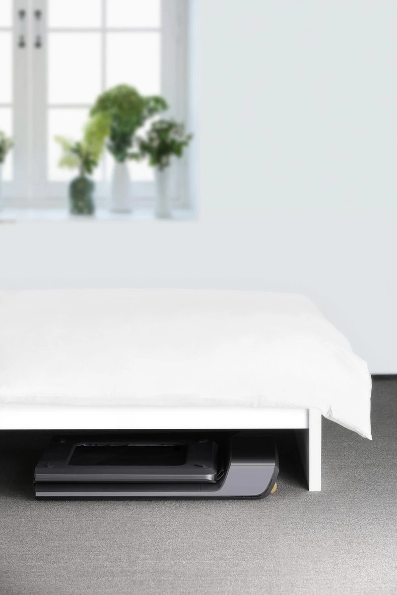 Dacht je dat de loopband al compact was met een hoogte van slechts 12,9 cm? Wacht dan tot je deze hebt ingeklapt. Het ingeklapte formaat is 82,5 x 54,7 en de hoogte blijft gelijk. Je schuift het apparaat na je training dus gewoon onder de bank, je bed of onder een kast.
