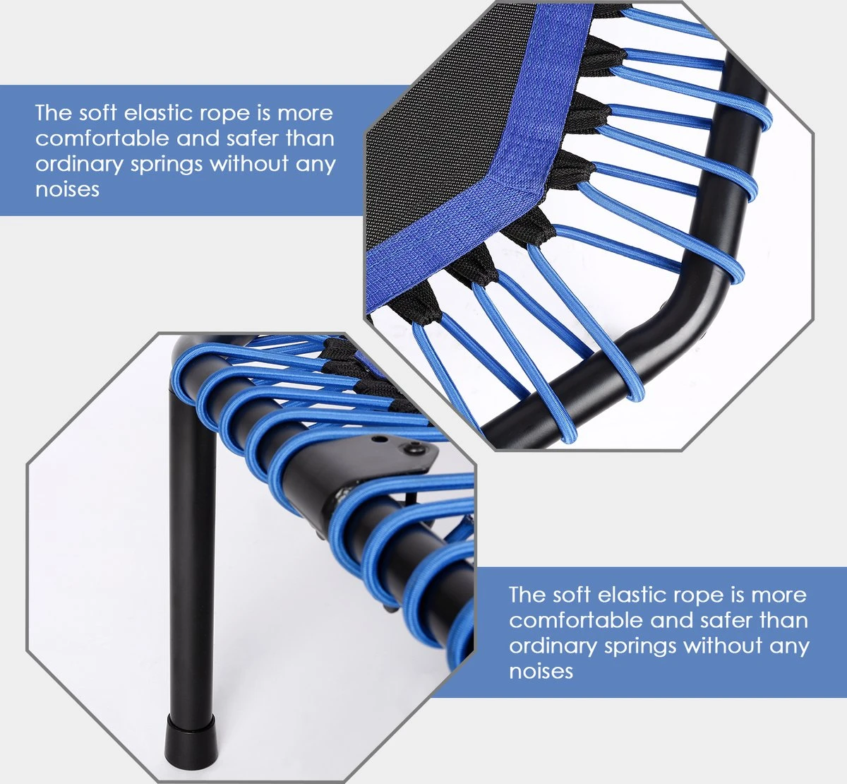 – De trampoline heeft blauw elastieken.
