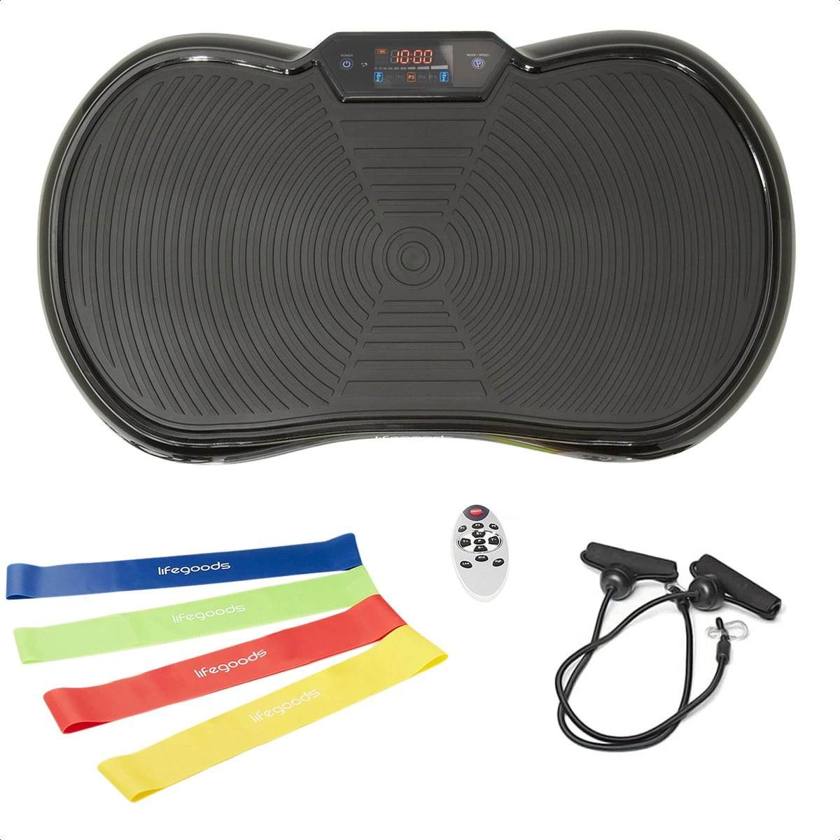 Met de LifeGoods Trilplaat kan je je hele lichaam trainen, gewoon vanuit huis. Stel de timer in (1 – 20 minuten) en kies tussen 180 verschillende intensiteitslevels tot wel 2700 vibraties per minuut. Of selecteer een van de 5 vooraf ingestelde trainingsprogramma’s. Met de zes meegeleverde weerstandsbanden en de 10 oefeningen op de workoutposter maak je je workout helemaal compleet. Druk bezig? Bedien de trilplaat dan met de afstandsbediening. Na 10 minuten schakelt de trilplaat automatisch uit. Maak nu van je standaard trainingssessie een intense workout met de LifeGoods Trilplaat.