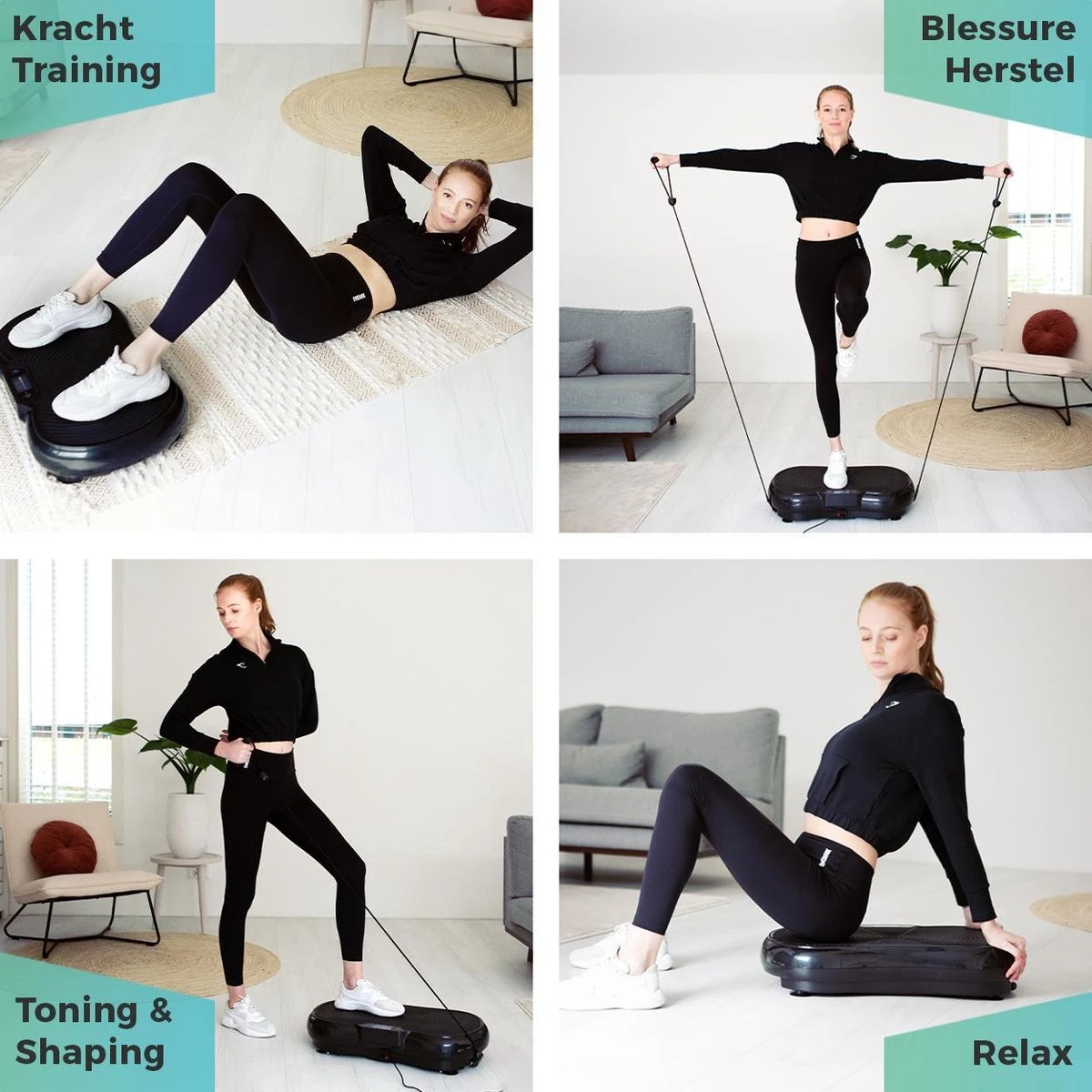 Om je hele lichaam te kunnen trainen, krijg je bij de trilplaat 2 weerstandskabels met handvat en 4 rubberen resistance bands. De weerstandskabels met handvatten kan je vastklikken aan de trilplaat om nog meer oefeningen in je workout te verwerken. De rubberen resistance bands hebben verschillende weerstanden, voor ieder wat wils!