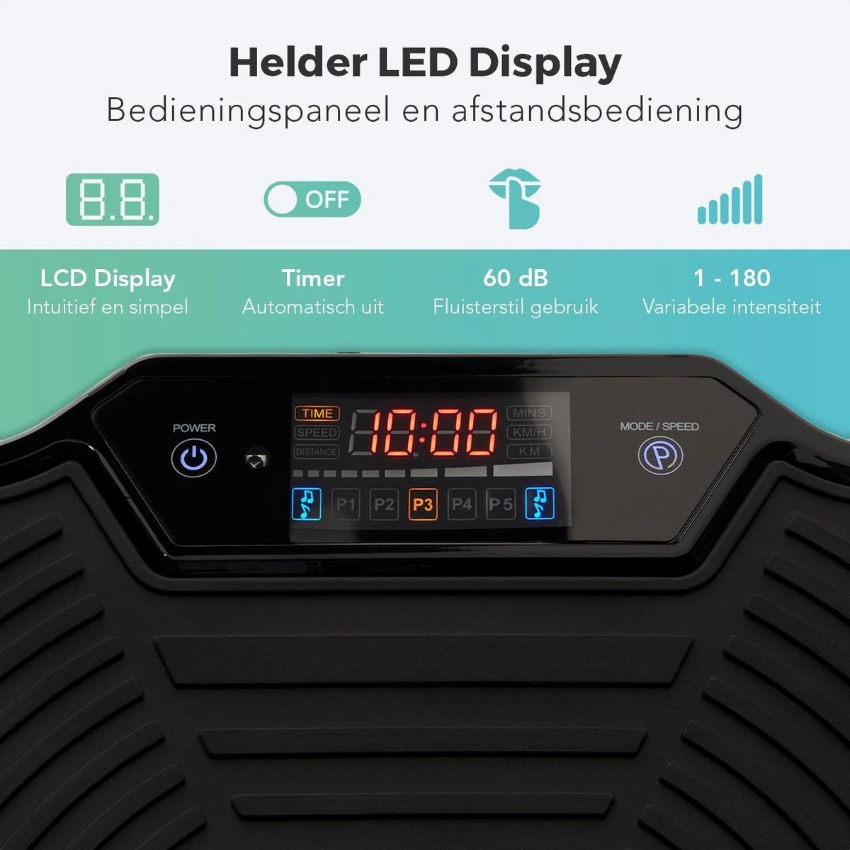 De 200W Trilplaat heeft 180 intensiteitslevels en gaat tot 2700 vibraties per minuut. Kies een lagere intensiteit voor een lekkere warming-up of cooling down. Verhoog het intensiteitslevel om je trainingssessie nog uitdagender te maken. Door het antislip oppervlak blijf je altijd stevig staan. Je kan zelf de timer instellen van 01:00 – 20:00 min. Daarnaast krijg je er ook een workout poster bij met verschillende oefeningen. Perfect voor ervaren en beginnende sporters.