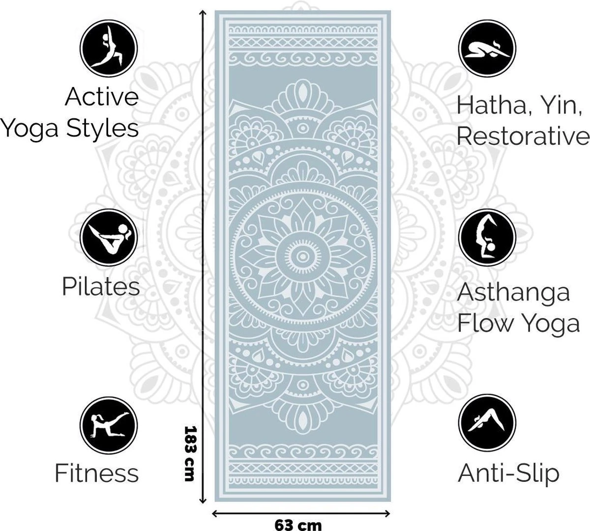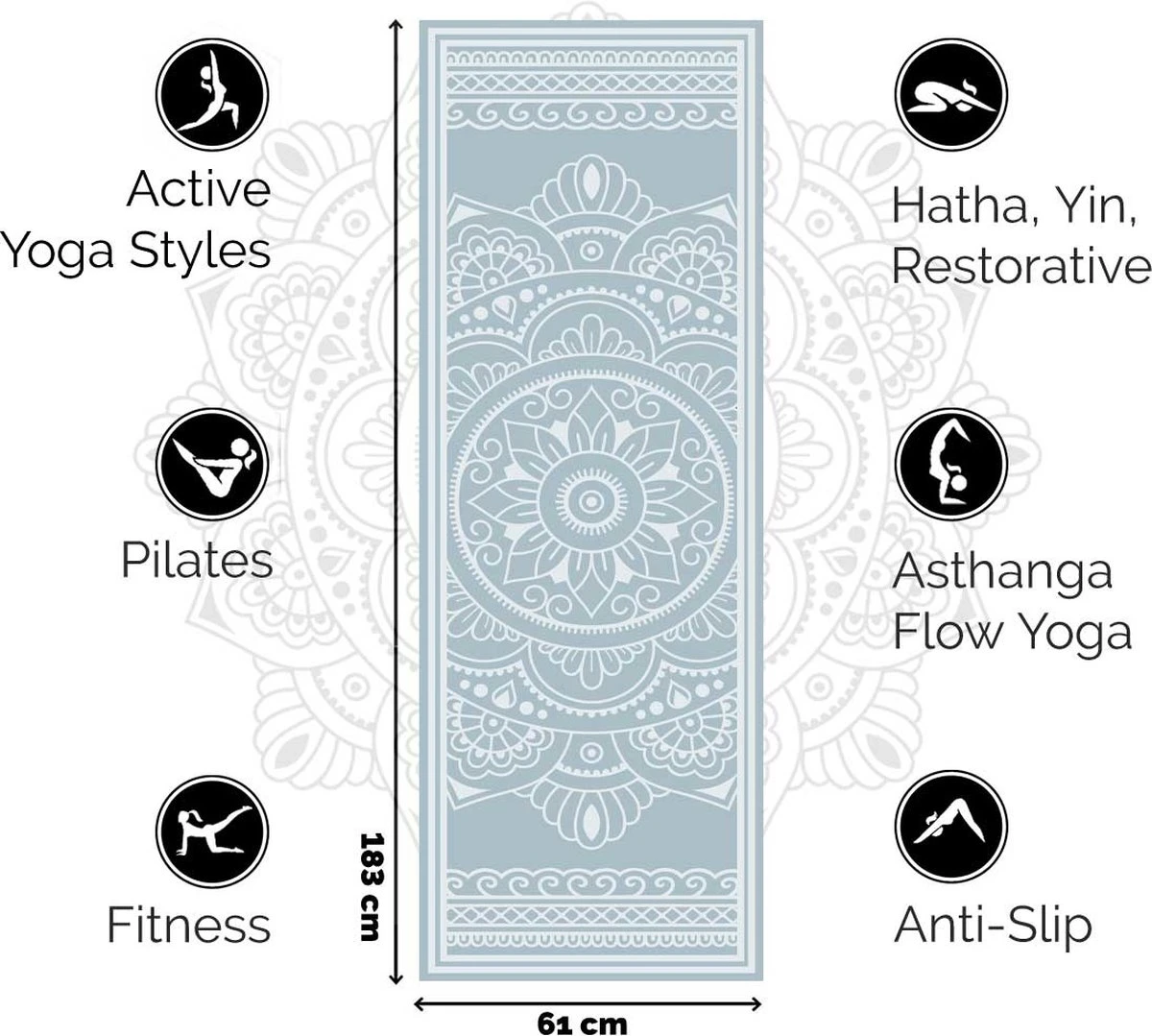 183 cm lang x 61 cm breed x 6 mm dik Lichtgewicht (+/- 1.7 kg) Anti slip / sticky Wordt steeds stroever door gebruik Wasbaar, maar wees voorzichtig met de print Slijtvast en zacht PVC materiaal SGS gecertificeerd dus goedgekeurd voor de Europese markt OEKO-TEX® STANDARD 100 certificering, getest op schadelijke stoffen en onschadelijk voor de menselijke gezondheid Geschikt voor een dagelijkse yogapractice Geschikt voor alle yogastijlen en ook als fitnessmat & pilates mat Ook een fijn yogamatje voor beginners