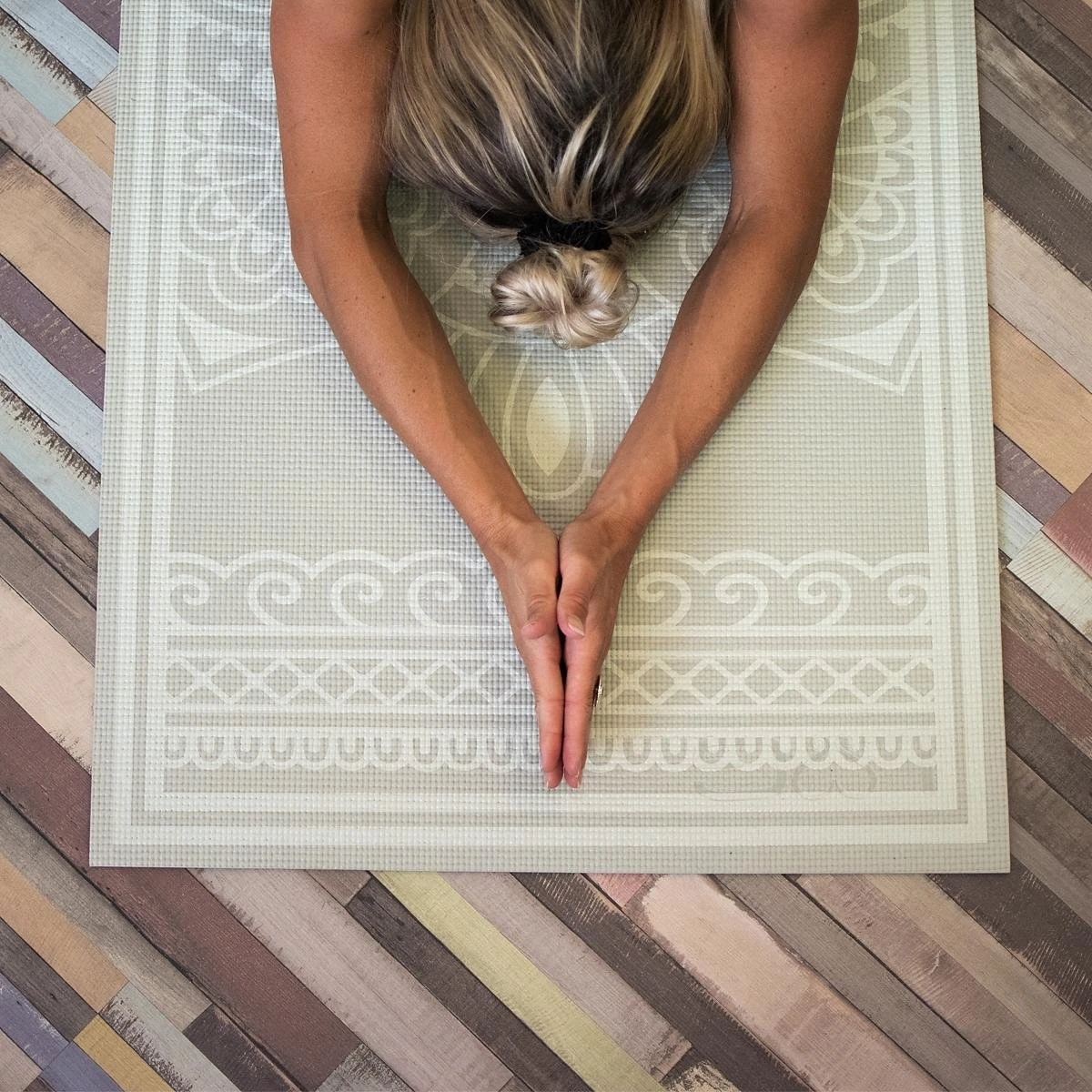 Deze Mintkleurige yogamat van Love Generation is voorzien van een schitterende geometrische print. Het design is geïnspireerd op Mehndi patronen van henna, die je ziet op de handen van Indiase bruiden. Deze print geeft je een gelijk een focuspunt, die je kan helpen tijdens je balansoefeningen.