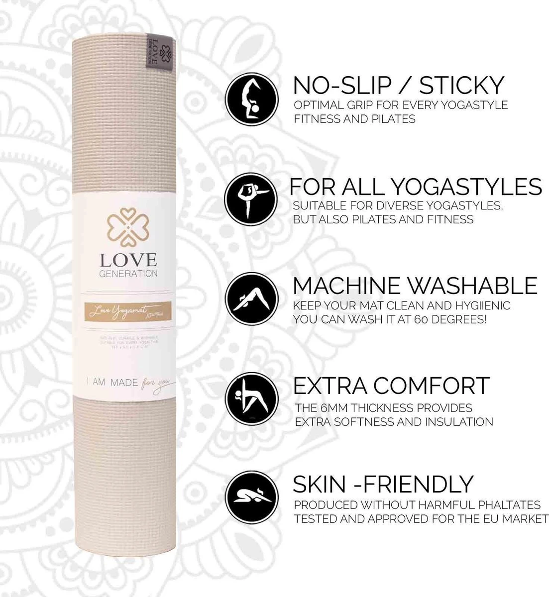 Deze Love Yogamat heeft een natuurlijke zandkleur en een opgestikt merklabeltje. Love Generation ontwikkelde voor jou 11 aardse kleuren in deze serie. Kies zorgvuldig jouw favoriete kleur; het materiaal is slijtvast , waardoor je lang plezier van deze mat zal hebben.