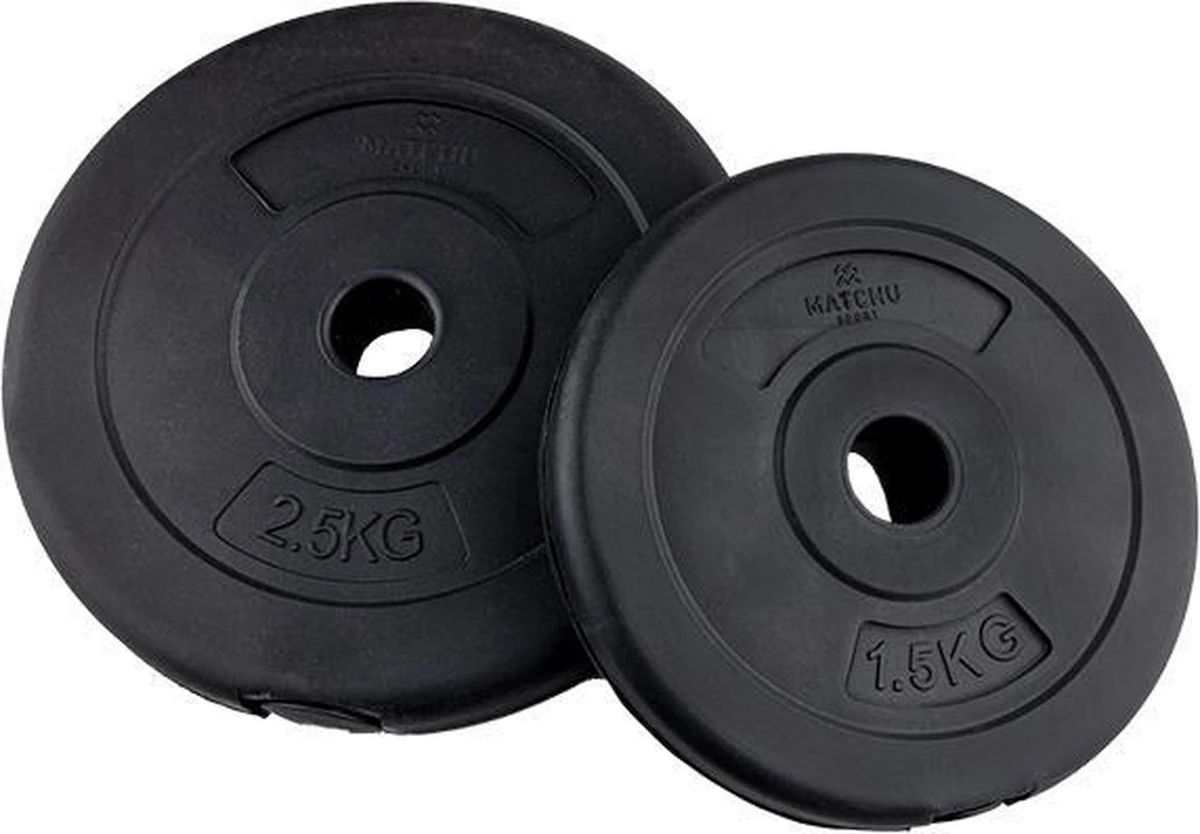 ✓ 8 gewichtsschijven (4 x 2,5 kg + 4 x 1,5 kg)
