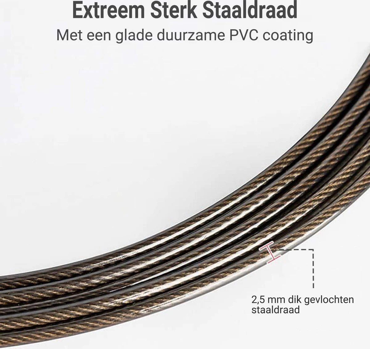 Het springtouw van Positive Things is gemaakt van de hoogste kwaliteit materialen. Het handvat is van aluminium en voorzien van een anti-slip structuur voor extra grip. Het touw van het speedrope is een staaldraad met PVC coating van slechts 2,5 mm dik. Het tempo verhogen is geen enkel probleem!