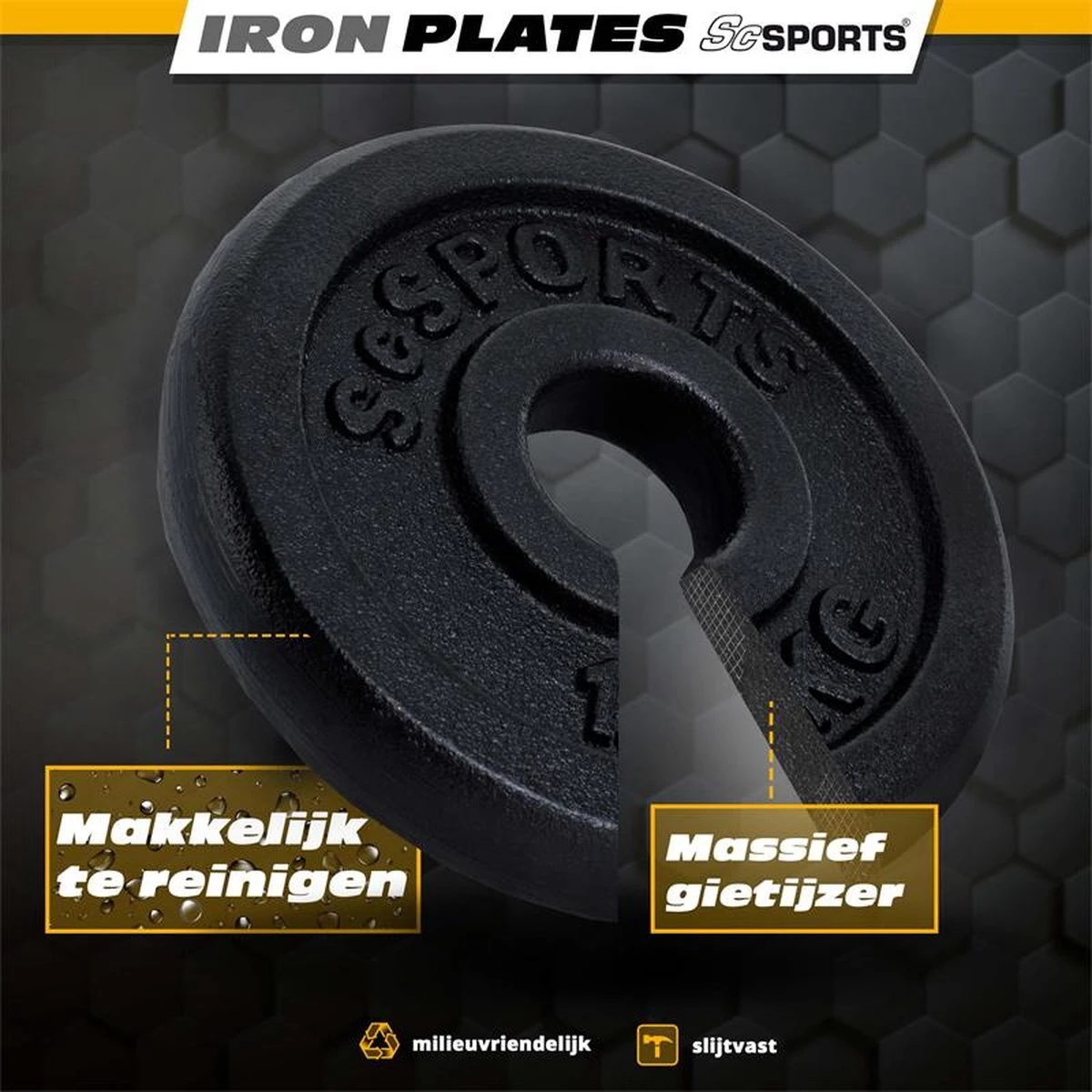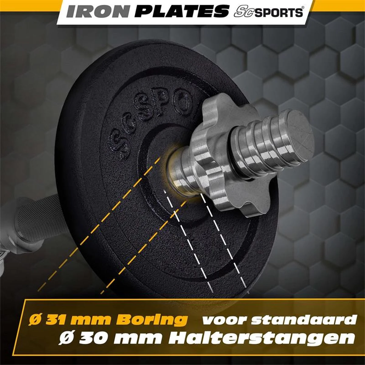 De gietijzeren schijven hebben een boring van 30/31 mm en zijn daarom perfect afgestemd op alle gangbare halterstangen met een diameter van 30 mm.