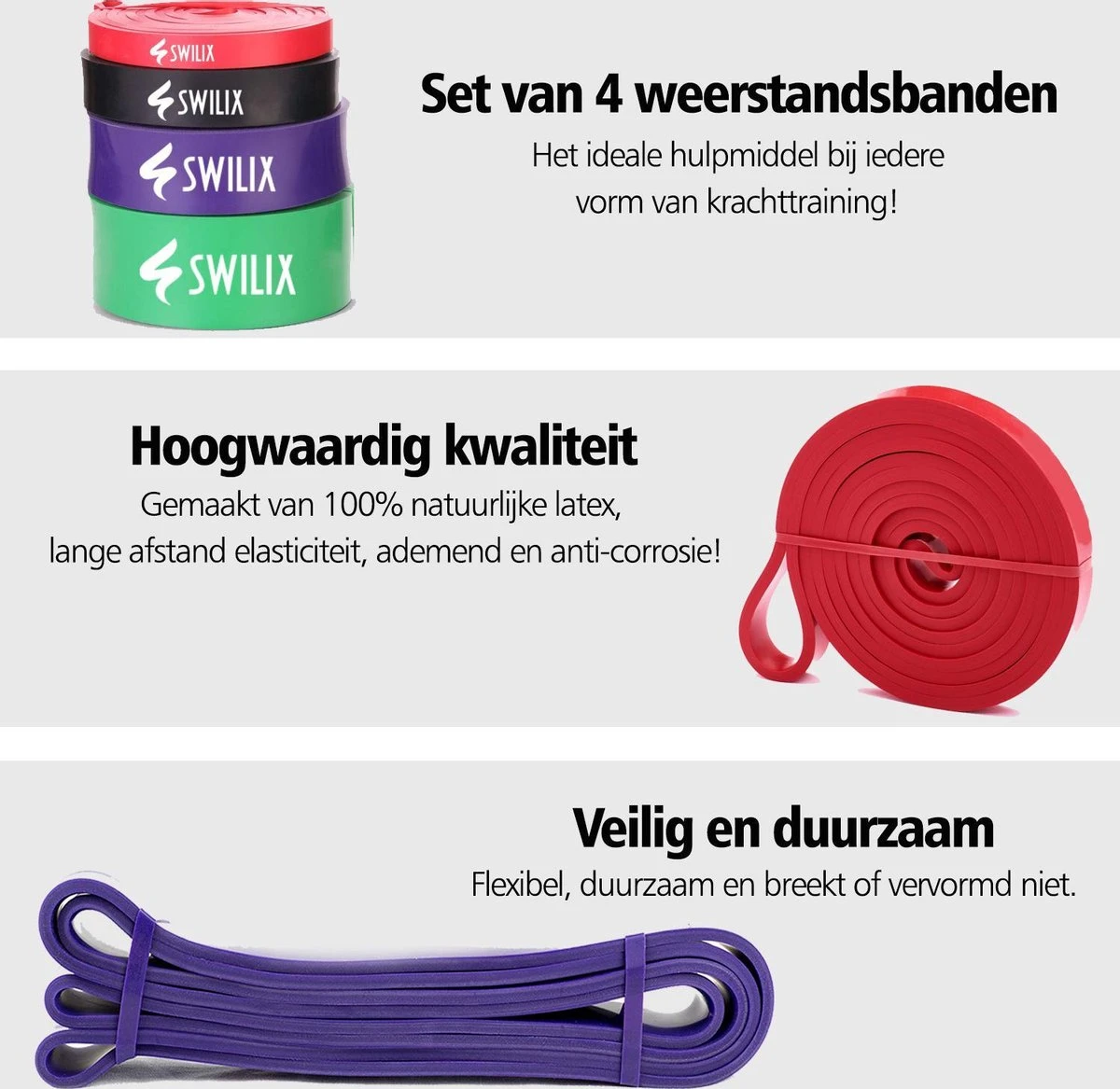 De Swilix Resistance Bands zijn gemaakt van 100% duurzaam latex rubber. De weerstandsbanden zijn naadloos en hebben hierdoor geen zwakke punten waar deze kunnen scheuren. Elke band heeft een dikte van 4,5 millimeter. Dit alles bij elkaar maakt dat de Swilix Power Bands kwalitatief erg sterk zijn en langer meegaan. Daarnaast hebben de bands een lengte van 208 centimeter. Dit is de perfecte lengte voor de meeste oefeningen. De Complete Pack bevat vier resistance bands: de extra light, light, medium en b uitvoering. De weerstand van deze banden varieert van 6 tot en met 56 kg.