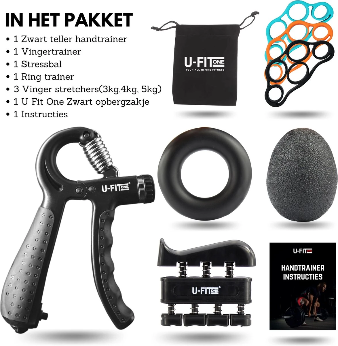 U-Fit One 7 Delige Handtrainer Set – Verstelbare Teller Handgrip – Handknijper – Knijphalter – Stressbal – Vingertrainer – Onderarm Trainer