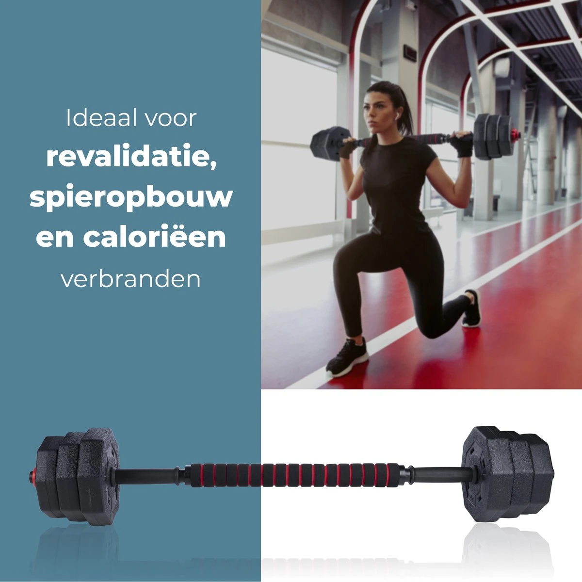 Naast twee stangen van 42 centimeter wordt er ook een verbindingsstang van 40 centimeter meegeleverd met de halterset. Met deze verbindingsstang kun je de twee kleinere stangen aan elkaar verbinden om vervolgens een barbell te maken. Ook met de barbell kies je uiteraard zelf het hoeveelheid gewicht waarmee je wil trainen. De verbindingsstang waarmee je de barbell maakt beschikt over een anti slip handgreep waardoor je de gewichten comfortabel en stevig in je handen hebt liggen.
