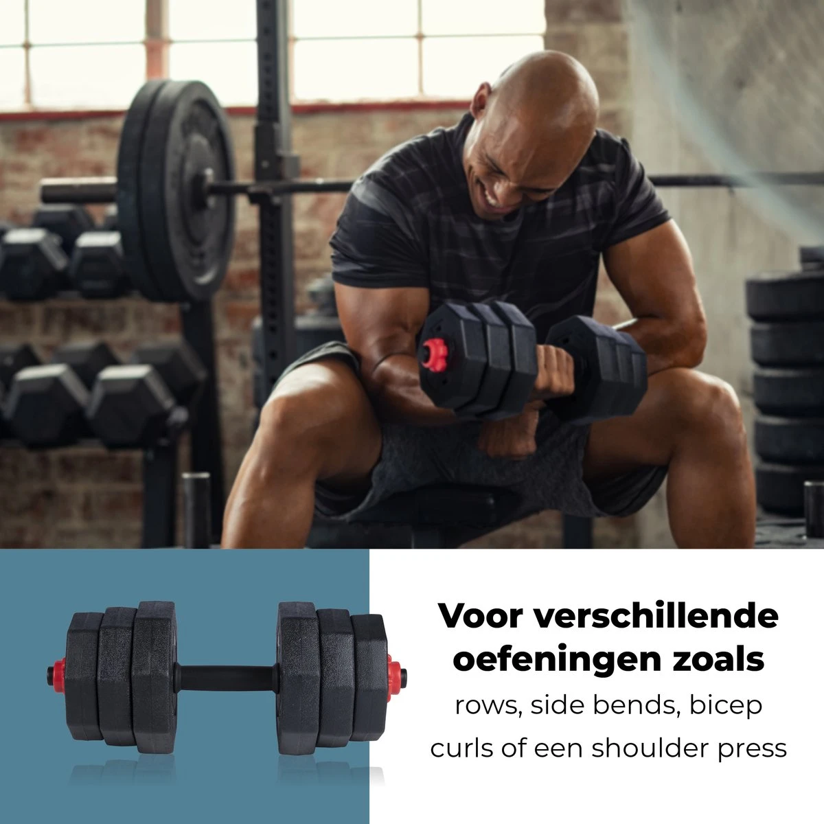Dankzij de aanwezigheid van gewichten van 1.25 kilogram tot 2 kilogram en 2 stelen met een lengte van 42 centimeter kun je twee dumbells maken met het gewicht dat bij jouw niveau past. Wanneer je het juiste gewicht aan de stangen hebt geschoven is het altijd belangrijk om deze voor de veiligheid vast te maken met de bijgeleverde moeren. Gebruik de dumbells uit de halterset voor verschillende oefeningen zoals rows, side bends, bicep curls of een shoulder press.