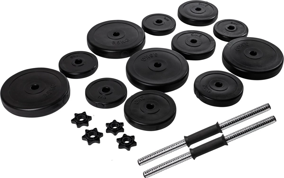 – 2 dumbellstangen met een diameter van 25 mm met een gewicht van 650 gram.