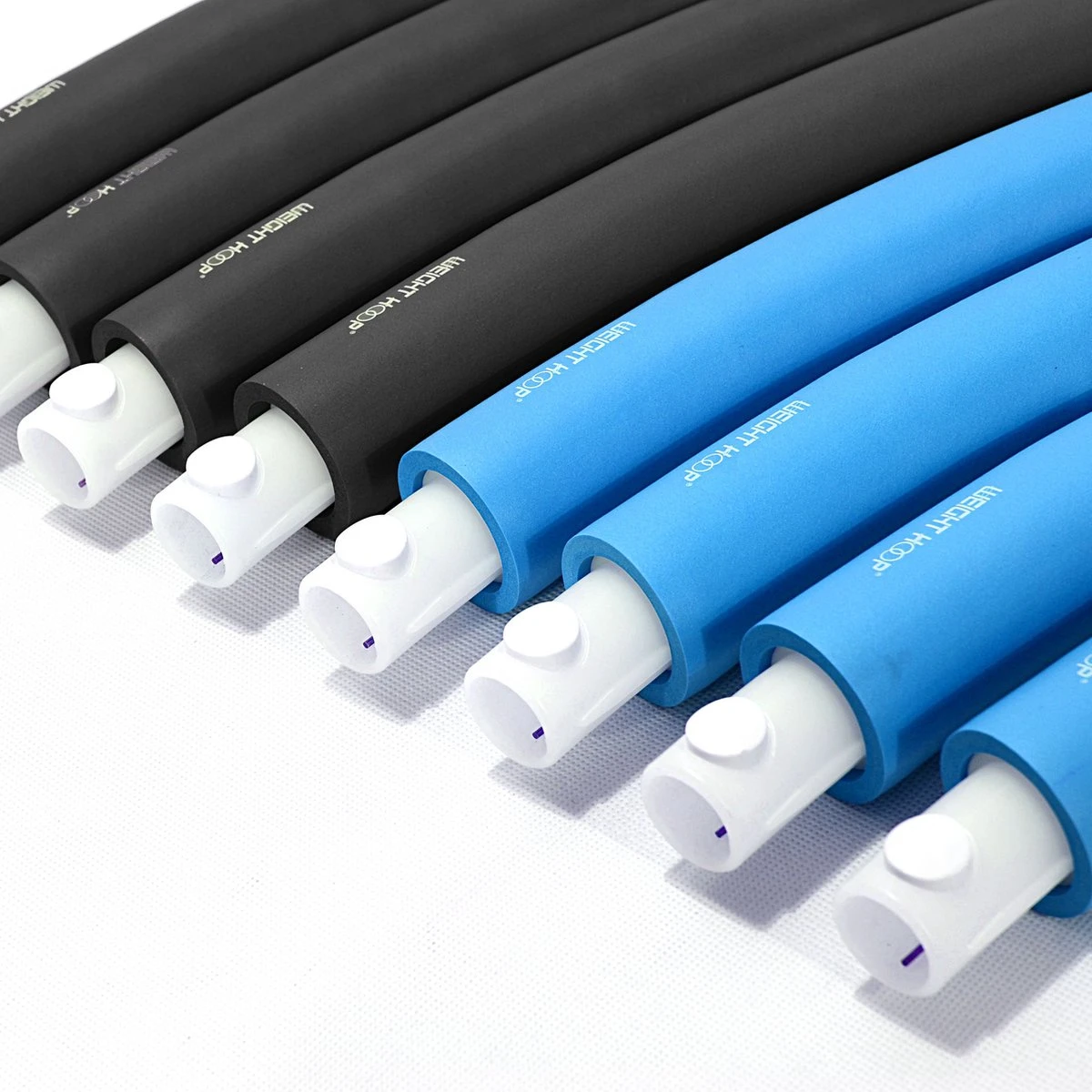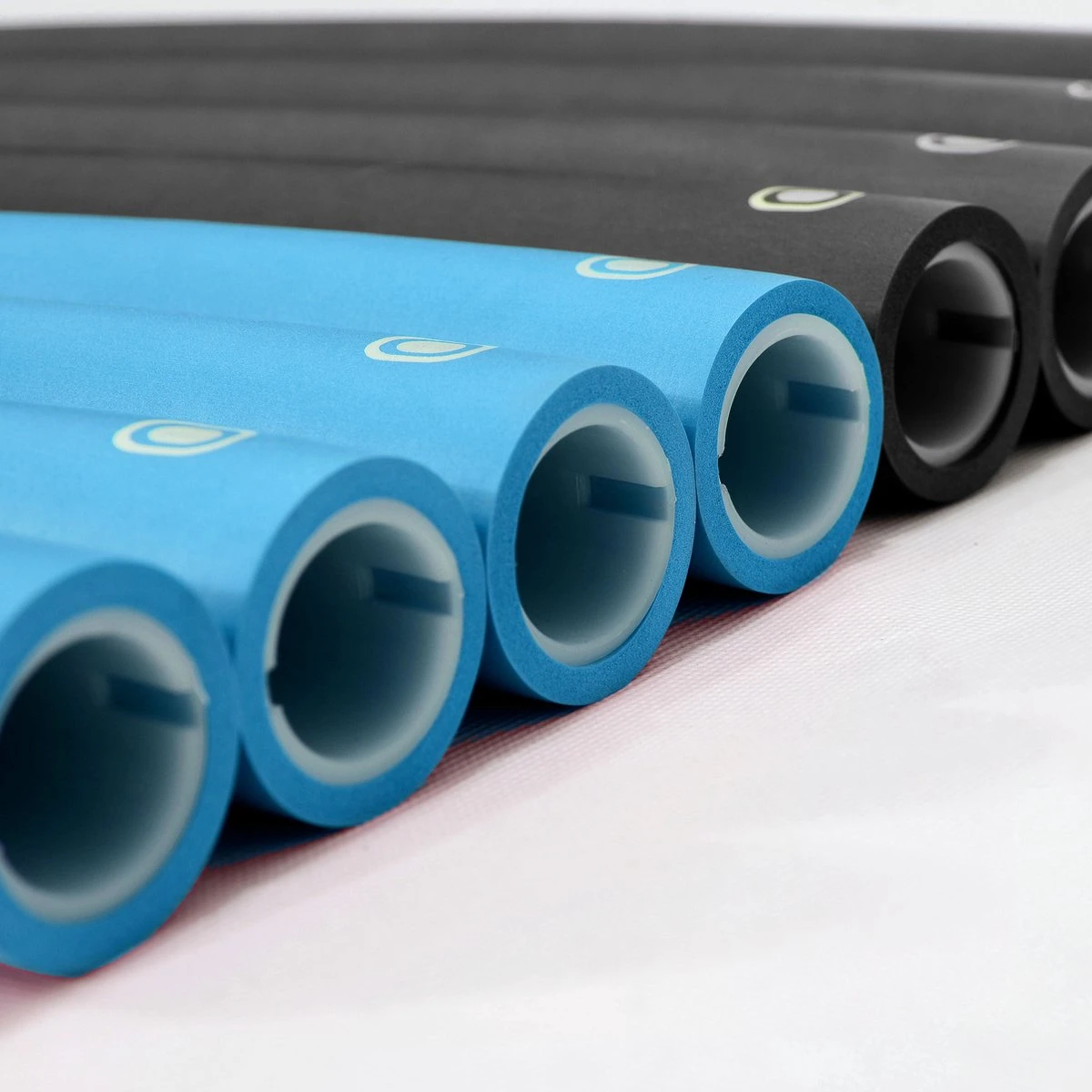 - Aan de buitenkant omgeven door dikke laag (5 mm) NBR schuim. Dit schuim, van welke merk dan ook, is wel altijd vrij kwetsbaar materiaal. Het is daarom belangrijk om tijdens het hoepelen altijd te zorgen voor voldoende afstand tot meubels en dergelijke. Ook om je meubels te beschermen overigens ;-). Let ook op met ruwe vloeren (zoals betonnen stoeptegels) en scherpe nagels. Overigens maakt de dikte van het foam wel veel verschil. In een dikkere laag zal veel minder snel een scheurtje komen.