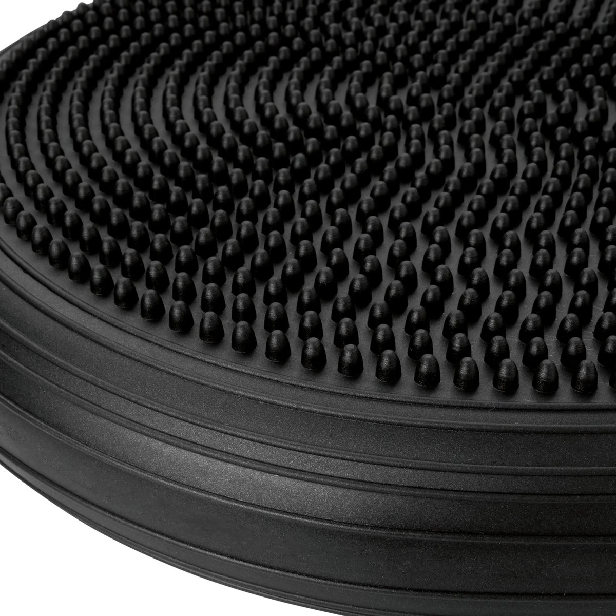 Rubber materiaal: Het wiebelkussen is gemaakt van rubber. Hierdoor is het kussen stevig en zit het aangenaam. De bovenzijde is voorzien van enkele ribbels die fungeren als een anti-slip oppervlak. De onderzijde is tevens voorzien van een serie noppen om te voorkomen dat het kussen wegglijdt. Door het rubberen materiaal kan het kussen maximaal 120 kg verdragen.