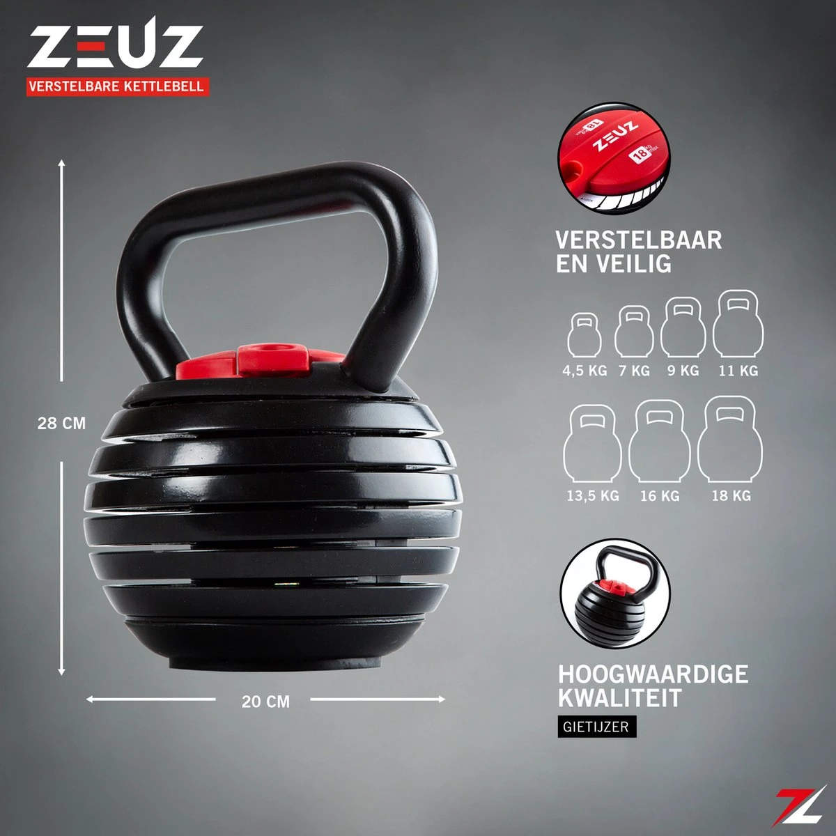 â–ª Verstelbare gewichten: 4.5, 7, 9, 11, 13.5, 16 & 18 kilo